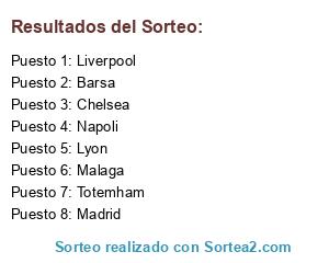 Lista de participantes: Madrid, Totemham, Barsa, Napoli, Lyon, Liverpool, Malaga, Chelsea.