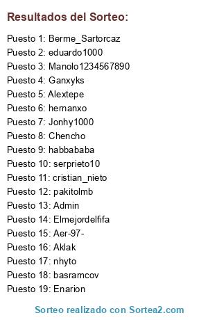 Lista de participantes: Alextepe, Admin, pakitolmb, eduardo1000, hernanxo, habbababa, Elmejordelfifa, cristian_nieto, Manolo1234567890, Chencho, Berme_Sartorcaz, basramcov, Enarion, serprieto10, nhyto, Ganxyks, Jonhy1000, Aklak, Aer-97-.