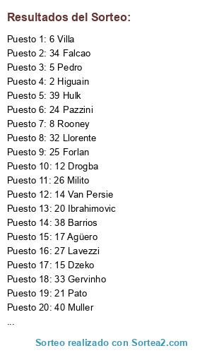 Lista de participantes: 1 Cristiano, 2 Higuain, 3 Benzema, 4 Messi, 5 Pedro, 6 Villa, 7 Alexis, 8 Rooney, 9 Chicharito, 10 Berbatov, 11 Torres, 12 Drogba, 13 Luis Suarez, 14 Van Persie, 15 Dzeko, 16 Tevez, 17 Agüero, 18 Balotelli, 19 Adebayor, 20 Ibrahimovic, 21 Pato, 22 Robinho, 23 Cassano, 24 Pazzini, 25 Forlan, 26 Milito, 27 Lavezzi, 28 Lisandro, 29 Mario Gomez, 30 Eto'o, 31 Neymar, 32 Llorente, 33 Gervinho, 34 Falcao, 35 Defoe, 36 Walcott, 37 Cavani, 38 Barrios, 39 Hulk, 40 Muller.