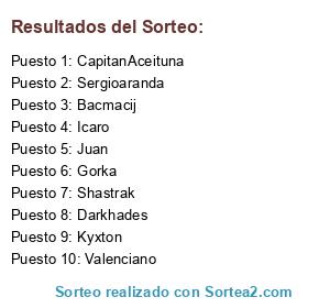 Lista de participantes: Sergioaranda, Bacmacij, Darkhades, CapitanAceituna, Kyxton, Gorka, Shastrak, Icaro, Valenciano, Juan.