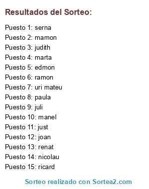 Lista de participantes: joan , manel , ricard , ramon , just , nicolau , martina , paula , marta , serna , soria , edmon , mamon , judith , juli , uri mateu , renat , .