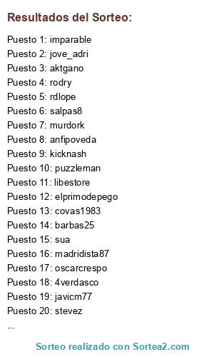 Lista de participantes: aktgano, rodry, elprimodepego, scantraxx, jove_adri, rdlope, covas1983, barbas25, salpas8, murdork, libestore, antonimomc, 4verdasco, benzem87, stevez, madridista87, puzzleman, oscarcrespo, kicknash, adri92, javicm77, imparable, sua, zatoichi, anfipoveda.