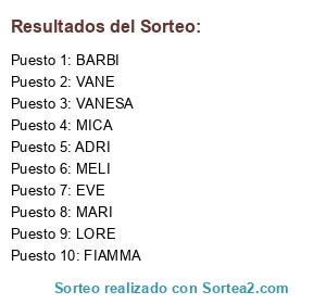 Lista de participantes: EVE, MELI, BARBI, VANE, FIAMMA, LORE, ADRI, MARI, VANESA, MICA.