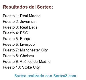 Lista de participantes: Stoke City, Liverpool, PSG, Real Betis, Real Madrid, Atlético de Madrid, Juventus, Chelsea, Barça, Manchester City.