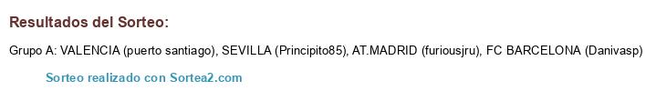 Lista de participantes: FC BARCELONA (Danivasp), AT.MADRID (furiousjru), SEVILLA (Principito85), VALENCIA (puerto santiago).