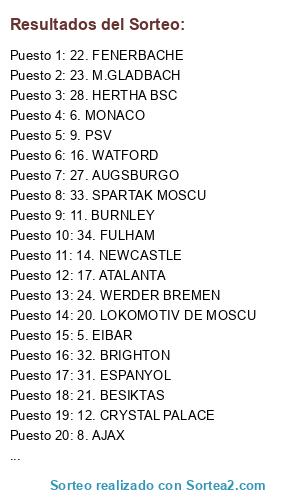 Lista de participantes: 1. GETAFE, 2. GIRONA, 3. CELTA DE VIGO, 4. REAL SOCIEDAD, 5. EIBAR, 6. MONACO, 7. NIZA, 8. AJAX, 9. PSV, 10. BOURNEMOUTH, 11. BURNLEY, 12. CRYSTAL PALACE, 13. LEICESTER, 14. NEWCASTLE, 15. SOUTHAMPTON, 16. WATFORD, 17. ATALANTA, 18. FIORENTINA, 19. TORINO, 20. LOKOMOTIV DE MOSCU, 21. BESIKTAS, 22. FENERBACHE, 23. M.GLADBACH, 24. WERDER BREMEN, 25. HOFFENHEIM, 26. LEIPZIG, 27. AUGSBURGO, 28. HERTHA BSC, 29. SPORTING BRAGA, 30. WOLVES, 31. ESPANYOL, 32. BRIGHTON, 33. SPARTAK MOSCU, 34. FULHAM.