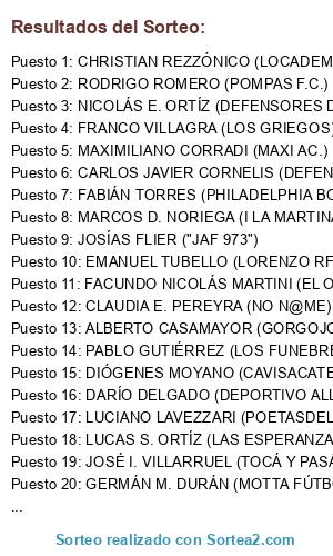 Lista de participantes: ALBERTO CASAMAYOR (GORGOJO FÚTBOL CLUB), ANDRÉS GABRIEL ALASSIA (ALASSIA F.C.), ARIEL AMAYA (CARA 21), CARLOS JAVIER CORNELIS (DEFENSORES DEL HIMEN), CHRISTIAN REZZÓNICO (LOCADEMIA CORDOBESA), CLAUDIA E. PEREYRA (NO N@ME), CRISTHIAN CAMINOS (ES UNA MANTECA NENE), DARÍO DELGADO (DEPORTIVO ALL IN), DIÓGENES MOYANO (CAVISACATE), EMANUEL CORTÉZ (CABJ), EMANUEL TUBELLO (LORENZO RF), EZEQUIEL BASUALDO (C.A.S.L. (CBA), FABIÁN TORRES (PHILADELPHIA BOXS), FACUNDO NICOLÁS MARTINI (EL OGRO F.C.), FEDERICO VILLEGAS (TALLERES DE AMÉRICA F.C.), FERNANDO SOTTANO (SOMOSOMOSOMO), FRANCO VILLAGRA (LOS GRIEGOS), GABRIEL DONDIO (BOCA FC 11), GERARDO MONTICH (T_ALENTARESIEMPRE), GERMÁN M. DURÁN (MOTTA FÚTBOL CLUB), GONZALO A. CÁRDENAS (POCA COCA JRS.), GUADALUPE A. MONTANI (TORNADO 5), GUILLERMO BESSONE (ANTÍLOPES07), HÉCTOR EDUARDO GANIM (5 AL FONDO), HERNÁN MONTANI (TORNADO UNO), IGNACIO SASTRE (LA KLOPPONETA), INGRID R. HEREDIA (LOS POROTITOS GLORIOSOS), JAIRO ALEXIS VALVERDE (JAIRO MATADOR), JAVIER MOYANO (ARQUITÉ BIGDT), JOSÉ FREYTE (FREY CLUB FC), JOSÉ I. VILLARRUEL (TOCÁ Y PASÁ POR ATRÁS), JOSÉ LUIS FORNACIARI (LA CROTA F.C.), JOSÍAS FLIER ("JAF 973"), JUAN PABLO PUSTERLA (VARICOCELE F.C.), JUAN PABLO REZZÓNICO (LOS MELLIS DE LA ACADÉ), LUCAS GROENDIJK (ARQUITE), LUCAS S. ORTÍZ (LAS ESPERANZAS DE LULA), LUCIANO LAVEZZARI (POETASDELCESPED), LUIS A. CASAMAYOR CEBALLOS (EL EQUIPO PAPÁ), MARCELO MELLANO (DINAMO FA), MARCOS D. NORIEGA (I LA MARTINA), MARIANO C. FLORES (C.A. WILLIAMS KEMMIS), MATÍAS E. GIUSTI (NUNCAUNGOL F.C.), MATÍAS JAVIER MARTINI (GUMMY BEARS), MAXIMILIANO CORRADI (MAXI AC.), NÉLSON REZZÓNICO (ARANDINA), NICOLÁS E. ORTÍZ (DEFENSORES DE EDMEI), PABLO A. SABEH (MÁNCHESTER SUIITY), PABLO GUTIÉRREZ (LOS FUNEBREROS DEL SARMIENTO), RAÚL CASAMAYOR (ESCUELA RAÚL), RODRIGO ROMERO (POMPAS F.C.), SANTIAGO VILLARRUEL (LA PALTA MECÁNICA), SEBASTIÁN MONTI (NOVOTIN), SERGIO TOBANELLI (SERENOS DE ONGAMIRA F.C.), STELLA MARIS GONZÁLEZ (GORDAOBESA F.C.), TOMÁS MOYANO (CLUB TOTORAL).