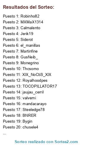 Lista de participantes: Guarro82, Ermakea_, chusele4, kapomc, canxo, Martinfine, Afr1knus, Calmalento, GusNeib_, Siderot, MXMaX1314, valvemi, rubenperez2, el_manillas, victor83, Absolon, Monegrino, Royalhoodpes, makopes, charlyboy81, Jerik19, jaujau_cerril, BNRER, mandacarayo, Robinho82, REY_ZIDANE, ury23, Steeledge78, XlX_NoCtiS_XlX, TOCOPILLATOR17, messiano, Kvt1984, Ivo8, Aragorn, Voodoomaax, Thcsomo, Rukistyle, Bygin, Adrian, Los_piratas.