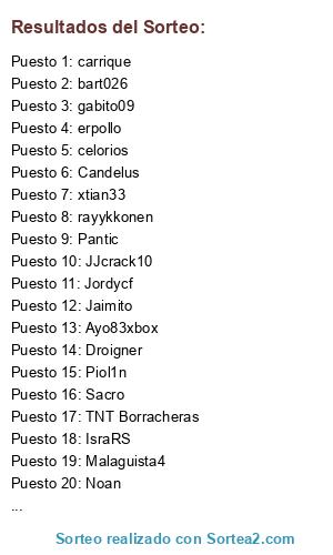 Lista de participantes: paolo, TNT Borracheras, Pantic, mojopikon, Sacro, bart026, Piol1n, celorios, JJcrack10, Ayo83xbox, rayykkonen, Jusedilo, carrique, LinKiN, gabito09, Jordycf, xtian33, erpollo, Jaimito, Joselito, Candelus, Malaguista4, IsraRS, Noan, Droigner.