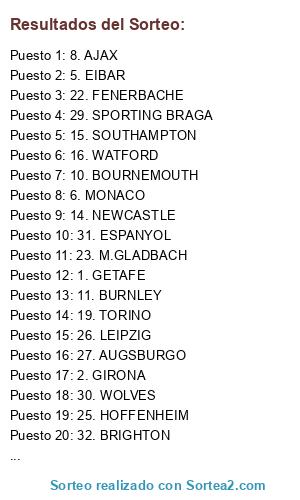 Lista de participantes: 1. GETAFE, 2. GIRONA, 3. CELTA DE VIGO, 4. REAL SOCIEDAD, 5. EIBAR, 6. MONACO, 7. NIZA, 8. AJAX, 9. PSV, 10. BOURNEMOUTH, 11. BURNLEY, 12. CRYSTAL PALACE, 13. LEICESTER, 14. NEWCASTLE, 15. SOUTHAMPTON, 16. WATFORD, 17. ATALANTA, 18. FIORENTINA, 19. TORINO, 20. LOKOMOTIV DE MOSCU, 21. BESIKTAS, 22. FENERBACHE, 23. M.GLADBACH, 24. WERDER BREMEN, 25. HOFFENHEIM, 26. LEIPZIG, 27. AUGSBURGO, 28. HERTHA BSC, 29. SPORTING BRAGA, 30. WOLVES, 31. ESPANYOL, 32. BRIGHTON, 33. SPARTAK MOSCU, 34. FULHAM.
