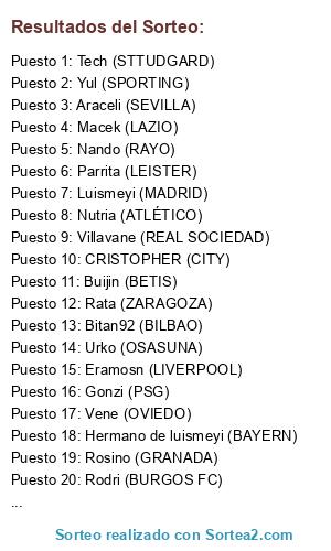 Lista de participantes: Buijin (BETIS), Chusky (VISSEL KOBE), Urko (OSASUNA), Vene (OVIEDO), Rudy (LAS PALMAS), Macek (LAZIO), Pazziemar (BARCELONA), Nando (RAYO), Fran (MANCHESTER UNITED), Rodri (BURGOS FC), Rondeño96 (VILLARREAL), Eramosn (LIVERPOOL), Bitan92 (BILBAO), Gonzi (PSG), NURHIO (PARMA), Shaman (AJAX), Parrita (LEISTER), CRISTOPHER (CITY), Rosino (GRANADA), Rata (ZARAGOZA), Nutria (ATLÉTICO), Anticule (CADIZ), MAISTER (CHELSEA), Tech (STTUDGARD), Araceli (SEVILLA), Yul (SPORTING), Villavane (REAL SOCIEDAD), Hermano de luismeyi (BAYERN), Oliver (MALAGA), Cobayo (CRUZ AZUL), Luismeyi (MADRID), Zombi (DORMUND).