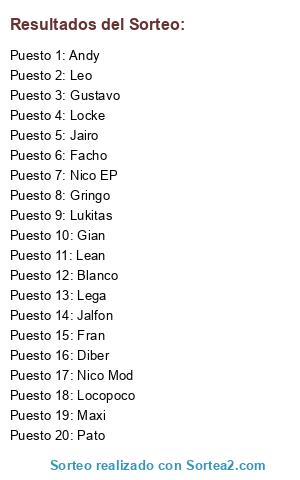 Lista de participantes: Locopoco, Jalfon, Andy, Gringo, Lega, Jairo, Blanco, Nico EP, Gian, Fran, Lean, Leo, Nico Mod, Lukitas, Gustavo, Pato, Diber, Locke, Maxi, Facho.