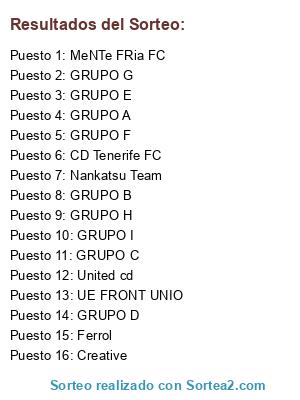 Lista de participantes: Nankatsu Team, MeNTe FRia FC, UE FRONT UNIO, CD Tenerife FC, Ferrol, Creative, United cd, GRUPO A, GRUPO B, GRUPO C, GRUPO D, GRUPO E, GRUPO F, GRUPO G, GRUPO H, GRUPO I.