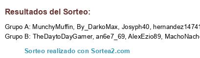 Lista de participantes: TheDaytoDayGamer, MunchyMuffin, Josyph40, By_DarkoMax, an6e7_69, hernandez14741, MachoNacho90, AlexEzio89.
