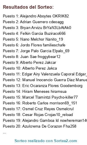 Lista de participantes: Juan Moncada Juanxavi8, Osmel Cruz Reyes Osmelcrul, Felkin Garcia Buziraco666, Cesar Rojas Crojas10_reload, Alberto Herrera carlo_calderone, Alejandro Aboytes OKRIK82, Nano Melchor Nanito_19, Hiram Meneses hiramsua, Carlos Alberto Garcia Gutierrez Carlos_messi87, Adrian Guerrero cdeoagg, Manuel Inocencio Guerra Diaz Manuelgd87, Edgar Airy Valenzuela Caporal Edgar_Airy, Bryan Arvizu BrYaN3LbAtAk0, Alejandro Gamboa Id nowhereman1402, Alberto Perez Jakcar, Victor Flores Corral Vaca6682, Paco Puigjaner puigjaner, Roberto Carlos morrison69_151, Eric Ocaranza Flores Goodemborg, Mariano Rosas PatriotGunner96, Alberto Perez Jakca, Jorge Palo Garcia Elpalo_69, Marcel Tlamintzi Psycho-killer77, Jordo Flores familieschafe, Juan Sae froggybear12, Azulcrema De Corazon Fha258.