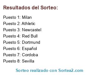 Lista de participantes: Milan, Sevilla, Athletic, Cordoba, Español, Red Bull, Dortmund, Newcastel.