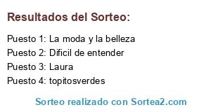 Lista de participantes: topitosverdes(2 participaciones), Dificil de entender(4 participaciones), La moda y la belleza(3 participaciones), Laura(5 participaciones).