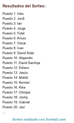 Lista de participantes: Arturo, Kike, Rafa, Javi, Andrés, David Soler, Fidel, Jorge, Jordi, Jonhy, Kennet, Ian, Jesús, Mehdi, Oscar, Ivan, Claudia, Olimpia, Alejandro, Inés, Gabriel, David Santinja, Edison.