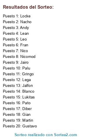 Lista de participantes: Jalfon, Lukitas, Fran, Lean, Andy, Nico, Nacho, Leo, Gustavo, Palu, Pato, Locke, Gringo, Martin, Jairo, Gian, Lega, Blanco, Nicomod, Diber.