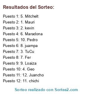 Lista de participantes: 1. Mauri, 2. kevin, 3. TuCu, 4. Geo, 5. Mitchelt, 6. Maradona, 7. Fer, 8. juampa, 9. Loaiza, 10. Pedro, 11. chichi, 12. Juancho.