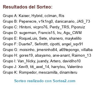 Lista de participantes: Sete, Van_Nicky, titi_axel_14, Perdy_TRS, Raimon_13, moisinho, danicanario, dinamiteru, cclman, Duarte7, Ris, Artero, Francis15, juandy, JAS_73, maykelillo, gores19, Xevi9, RoqueLuis, villalba, Hintoni, Piporuiz, Kaiser, Rompedor, harrytxu, Valentino, Hybrid, davidiho10, Agu_CWM, mescamilla, angel_sqv91, a69tepongo, cipotti, Iru, shanero, ane-anant, Peperecre, Sefirottt, v1k1ng0, sugerman, abayamo, jimeninho84, vicpro76.