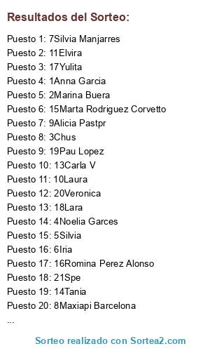Lista de participantes: 1Anna Garcia(2 participaciones), 2Marina Buera(2 participaciones), 3Chus, 4Noelia Garces, 5Silvia, 6Iria(3 participaciones), 7Silvia Manjarres, 8Maxiapi Barcelona, 9Alicia Pastpr(2 participaciones), 10Laura, 11Elvira, 12Nerea R., 13Carla V, 14Tania, 15Marta Rodriguez Corvetto, 16Romina Perez Alonso(2 participaciones), 17Yulita, 18Lara, 19Pau Lopez, 20Veronica, 21Spe.