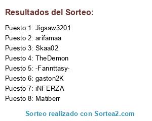 Lista de participantes: Skaa02, Jigsaw3201, iNFERZA, Matiberr, gaston2K, TheDemon, arifamaa, -Fannttasy-.