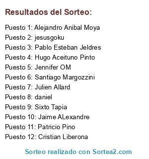 Lista de participantes: jorgevera, Sebastian Hurtado Torres, Mauricio Leon Torino, Jose Miguel Abarca Bignon, Alexis Garcia, mrclopezm, carladefranchi, Carlos Montenegro Bustos, Javiera Esteban, Max Quintana Korze, ambarcirijilla, Marie Merle, Arce Arce Fredy Alexis, Javier Silva Valdebenito, Ignacio Fernandez Escalona, Ian Franco Cardenas, Nahuel JA, Santiago Margozzini, Edutourism, Alejandra Hernandez Villanueva, Juan Concha, Esteban Mardones Ceballos, Leslie Andrea, Cristian Liberona, Julien Allard, Claudia Gonzalez (@clau_gonzce), luis, Soledad Alvarado, Wilber Jesus Chipao, Nathy Colmenares, Carlos Andres Vera reyes, Denise Patricia Gonzalez, Caro Pérez, Pablo Esteban Jeldres, Jaime Vergara Garrido, fcorread, Rosario Fernandez del Rio, Hugo Aceituno Pinto, Rodrigo Musa, Guillermo Ravest, Javier Molleda Curie, sghuidobro, Jerko Lasnibat, Pablo Quinteros Zuñiga, Patricio Pino, Daniel.Rulo, Mirna Arancibia, Alejandro Anibal Moya, Renaud Laine, Stephanie Geywitz, Mauricio Orozco Lazcano, Tobias Merino, Jorge Carrillo, Fernando Musalem, daniel, Jesus Esteban Martinez, Oscar Lefiguala, jesusgoku, Fernando Javier Riveros, Sixto Tapia, Daniela De La Cerda Naim, Raul Ivan, Jennifer OM, Jaime ALexandre, Victor Contreras, Dani Belen Gonzalez, zayOn, Dixie Andaur, Iñaki Canahuate, Filippo Ignacio Carrasco, bicampeondeamerica, Isara Soto ramirez, Maria Jose Pierotic, Cristian Alejandro Herrera, Felipe Andres Herrera, Oliver Goyeneche.