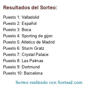Lista de participantes: Real Madrid, Crystal Palace, Llagostera, Atletico de Madrid, West Ham, Liverpool, Barcelona, monchengladbach, Celtic, Boca, Villarreal, Sturm Gratz, Real Sociedad, Kaizer Chies, Las Palmas, Dortmund, Roma, Sporting de gijon, Español, Valladolid.