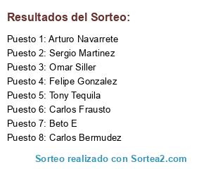 Lista de participantes: Arturo Navarrete, Carlos Bermudez, Felipe Gonzalez, Omar Siller, Sergio Martinez, Tony Tequila, Beto E, Carlos Frausto.