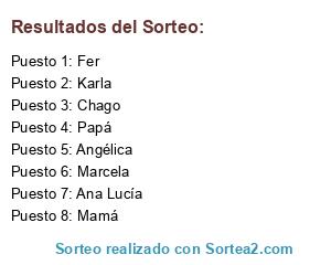 Lista de participantes: Marcela, Fer, Ana Lucía, Karla, Chago, Angélica, Mamá, Papá.