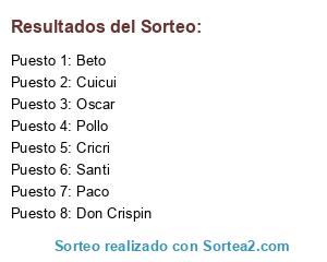 Lista de participantes: Cuicui, Paco, Oscar, Pollo, Cricri, Don Crispin, Santi, Beto.