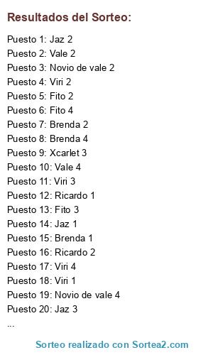 Lista de participantes: Jaz 1, Jaz 2, Jaz 3, Jaz 4, Viri 1, Viri 2, Viri 3, Viri 4, Fito 1, Fito 2, Fito 3, Fito 4, Brenda 1, Brenda 2, Brenda 3, Brenda 4, Ricardo 1, Ricardo 2, Ricardo 3, Ricardo 4, Vale 1, Vale 2, Vale 3, Vale 4, Novio de vale 1, Novio de vale 2, Novio de vale 3, Novio de vale 4, Xcarlet 1, Xcarlet 2, Xcarlet 3, Xcarlet 4.