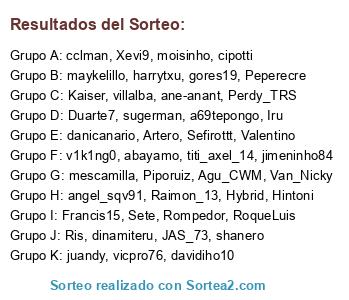 Lista de participantes: Sete, Van_Nicky, titi_axel_14, Perdy_TRS, Raimon_13, moisinho, danicanario, dinamiteru, cclman, Duarte7, Ris, Artero, Francis15, juandy, JAS_73, maykelillo, gores19, Xevi9, RoqueLuis, villalba, Hintoni, Piporuiz, Kaiser, Rompedor, harrytxu, Valentino, Hybrid, davidiho10, Agu_CWM, mescamilla, angel_sqv91, a69tepongo, cipotti, Iru, shanero, ane-anant, Peperecre, Sefirottt, v1k1ng0, sugerman, abayamo, jimeninho84, vicpro76.