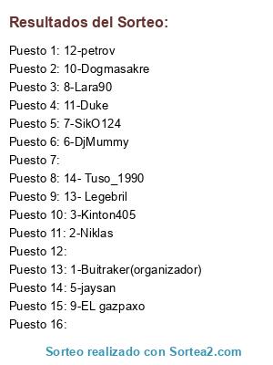 Lista de participantes: 1-Buitraker(organizador), 2-Niklas, 3-Kinton405, 4-ivo21, 5-jaysan, 6-DjMummy, 7-SikO124, 8-Lara90, 9-EL gazpaxo, 10-Dogmasakre, 11-Duke, 12-petrov, 13- Legebril, 14- Tuso_1990, , , .