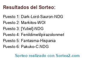 Lista de participantes: Fenildimetilpirazolonmet, Dark-Lord-Sauron-NDG, Pakuko-C.NDG, Fantasma-Hispania, [Yubel]-NDG, Markitos-WOI.