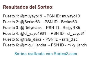 Lista de participantes: @MartinR15 - PSN ID - MartinR15, @Berker83 - PSN ID - Berker83, @rally2050 - PSN ID - rally2050, @migui_jandra - PSN ID - miky_jandra, @rafa_disci - PSN ID - rafa_disci, @centrifuga18 - PSN ID - centrifuga18, @Bloody Pleasure - PSN ID - Adri, @Pas_03 PSN ID - Pas_03, @el_yayo1981 - PSN ID - el_yayo81, @Dirtymack - PSN ID - RidgyRX5, @muyayo19 - PSN ID: muyayo19.