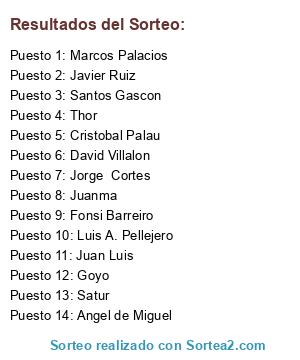Lista de participantes: Marcos Perez, Fernando Martínez, Satur, Aitor Moreno, Luis A. Pellejero, Antonio Diaz, Angel Luis Polo, Juanma, Angel de Miguel, Cristobal Palau, David Villalon, Jorge Cortes, Guillermo Remis, Sergio Garcia, Santos Gascon, Marcos Palacios, Jose Maria (Chema), Fonsi Barreiro, Sergio Ibañez, Javier Cebrian, Javier Ruiz, Goyo, Silvia Marchante, Ivan Serrano, Laura Andres, Thor, Juan Luis, Isabel, Inmaculada, Bea, Carmen.