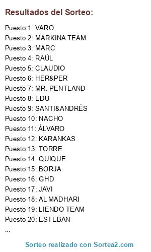 Lista de participantes: MR. PENTLAND, AL MADHARI, SANTI&ANDRÉS, NACHO, TORRE, LIENDO TEAM, MARKINA TEAM, MARC, JAVI, ESTEBAN, ÁLVARO, EDU, VARO, BORJA, RAÚL, GHD, LOREN, CLAUDIO, QUIQUE, HER&PER, JON, KARANKAS.