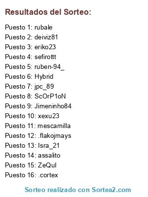 Lista de participantes: mescamilla, ruben-94_, xexu23, eriko23, Hybrid, rubale, .cortex, sefirottt, ScOrP1oN, assalito, .flakojmays, ZeQuI, jpc_89, Jimeninho84, deiviz81, Isra_21.