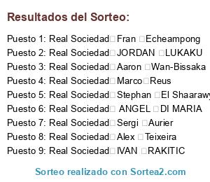 Lista de participantes: Real Sociedad IVAN RAKITIC, Real Sociedad Gareth Bale, Real Sociedad Filip Kostic, Real Sociedad Fran Echeampong, Real Sociedad FELIPE ANDERSON, Real Sociedad ALEX SANDRO, Real Sociedad Alex Teixeira, Real Sociedad Mário Figueira Fernandes, Real Sociedad NICOLAS DE LA CRUZ ARCOSA, Real Sociedad Marco Reus, Real Sociedad Yan Sommer, Real Sociedad FRANK ONYEKA, Real Sociedad VIKTOR KOVALENKO, Real Sociedad ALBERT BRAUT TJALAND, Real Sociedad JORDAN LUKAKU, Real Sociedad Falaye Sacko, Real Sociedad Frank Fabra, Real Sociedad Aaron Wan-Bissaka, Real Sociedad Ederson Santana de Moraes, Real Sociedad CHIDERA EJUKE, Real Sociedad JEREMIAH ST.JUSTE, Real Sociedad Sergio Agüero, Real Sociedad RIDLE BOTE BAKU.