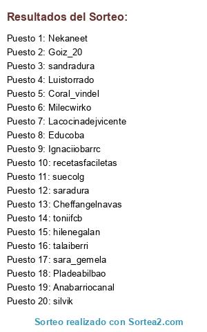Lista de participantes: Coral_vindel , Chopito_er , Servilletadetela , Alacena2020 , Goiz_20 , Sitohm1985 , Herederoperezisabel , Adri_tito , In_themood_food , Anabarriocanal , Angelluis_montefer , Cheffangelnavas , Anisoara , Be.barriocanal , C_pereira_m , Crmnvy , Carmensanjuan , Comosiempre , Carolinapalma , Denorteasur , Dianacepero , Disfrutable_ag , Distalbertoglez , Educoba , Euskalsouvenirs , Ferminfocus , Gariurdampill , Goofrettigranvia , Gutizicatering , Hornoamaya , Ivanguisado , Jimenacortes , Lacocinadejvicente , Jucar69 , Figominolas , Kikoduende5 , Losa621 , Luistorrado , Maarinasb , Mafarnes , Msotomayor , Milecwirko , Ignaciiobarrc , Nekaneet , Omargs93 , Orlandobnino , Pladeabilbao , Villamarcilla , r.gualca , roberth6147 , rrubencarrion , rpp_92 , aceitessanchez , pimpollina , sandrarodenas , sara_gemela , sofia_m_arenillas , suecolg , takayacomer , talaiberri , moreno_tm06 , toniifcb , Virginia_zabala_arruti , xabiergalpar , yuca.td , peremosa , volokin_spain , recetasfaciletas , sandradura , saradura , donosticity , gourmetlikeme , madeinspain , enriquesanchez , hilenegalan , juanturcastro , silvik , saboreandocabezon , gastr0wine , tengounhornoysecomousarlo , steffmaytals.