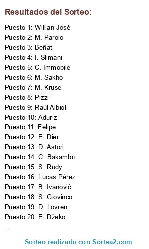 Lista de participantes: S. Coates, S. Giovinco, David Villa, D. Blind, D. Astori, C. Bakambu, M. Sakho, F. Acerbi, E. Džeko, Felipe, Lucas Pérez, B. Ivanović, Pizzi, Willian José, E. Dier, Naldo, L. Stindl, Raúl Albiol, I. Slimani, M. Kruse, Aduriz, M. Balotelli, C. Immobile, Beñat, Víctor Ruíz, M. Parolo, A. Kramarić, D. Lovren, S. Rudy, M. Valbuena, D. Sánchez, Jonas.