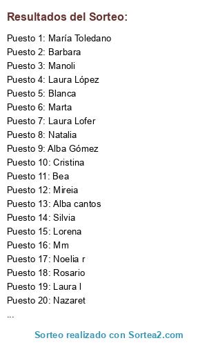 Lista de participantes: Mm, Nazaret, Alba Gómez, Sofia, Angela, Manoli, Cristina, Barbara, Alba cantos, Rosario, Laura Lofer, María Toledano, Laura j, Natalia, Mireia, Silvia, Lorena, Blanca, Marta, Bea, Noelia f, Noelia r, Laura López, Laura l.