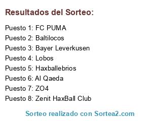 Lista de participantes: Lobos, ZO4, Haxballebrios, Baltilocos, Zenit HaxBall Club, FC PUMA, Al Qaeda, Bayer Leverkusen.