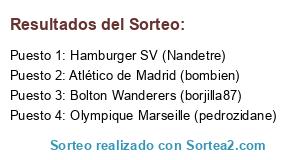 Lista de participantes: Atlético de Madrid (bombien), Bolton Wanderers (borjilla87), Hamburger SV (Nandetre), Olympique Marseille (pedrozidane).