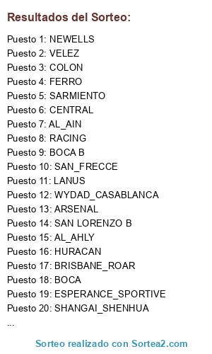 Lista de participantes: AL_AHLY, AL_AIN, ULSAN_HYUNDAI, SHANGAI_SHENHUA, SAN_FRECCE, ESPERANCE_SPORTIVE, WYDAD_CASABLANCA, BRISBANE_ROAR, VELEZ, TALLERES, FERRO, ITUZAINGO, HURACAN, SAN LORENZO B, SAN LORENZO, DEP MERLO, RIVER, NEWELLS, SAN MARTIN TUCUMAN, ESTUDIANTES, OLIMPO, RACING, COLON, BOCA B, ARSENAL, ALM.BROWN, ATL TUCUMAN, SARMIENTO, LANUS, BOCA UNIDOS, CENTRAL, CHACARITA, BOCA, SAN MARTIN SAN JUAN.