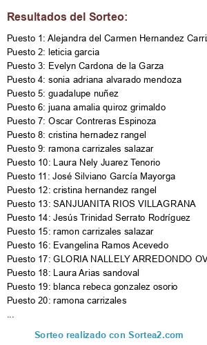 Lista de participantes: Alejandra del Carmen Hernandez Carrizales(2 participaciones), agustina herrera garcia, cristina hernadez rangel(3 participaciones), cristina hernandez rangel(3 participaciones), cristina hermadez rangel, criatina hermadez rangel, ramona carrizales salazar(22 participaciones), alejandra del Carmen hernandez, GLORIA NALLELY ARREDONDO OVALLE(2 participaciones), ramona carrizales, guadalupe nuñez, ramon carrizales salazar, josefa moran castro, luis carlos zuniga lugo, gaspar perez hernandez, JUAN RODRIGO VAZQUEZ PUENTE, FIDEL FERNANDO MARQUEZ ANGUIANO, blanca rebeca gonzalez osorio(3 participaciones), JOSE ANTONIO MARTINEZ PEREZ, juana amalia quiroz grimaldo(2 participaciones), Angelica Maria Lopez de lira(6 participaciones), Evangelina Ramos Acevedo(11 participaciones), Ricardo valenzuela Hdz(2 participaciones), Evelyn Cardona de la Garza(3 participaciones), blanca rrebeca gonzalez osorio, soraya yesenia cepeda guerrero(5 participaciones), Fidel Alejandro Hernandez Reyna, Maria de la Luz Rodriguez Ramos, Martha Patricia, Martha Patricia Leija zavala, DANIEL VALDEZ DEL REAL, sonia adriana alvarado mendoza(2 participaciones), Leticia Margarita Romero, leticia garcia(2 participaciones), José Silviano García Mayorga, María Isabel Arredondo Hernandez(2 participaciones), ALMA YOZANA RUIZ RUIZ, Daniela Hernandez Alvarez, Jesús Trinidad Serrato Rodríguez(2 participaciones), Carlos Alberto Hernández García, sonia julieta rodriguez delgado, eulogia delgado bautizta, Eduardo Quintanilla Martínez, Minerva Castro Carvajal, minerva castro carvajal, karina guadalupe chavez salazar, tomasa santana martinez, elvia j. martinez nuñes, Laura Arias sandoval, soraida iveth escareno juares, Oscar Contreras Espinoza, Ruibi Hernandes Zapata, Hugo Antonio Sauceda Montoya, Hugo Antonio Sauceda Perales, Blanca Patricia Montoya Frias, Brenda Judith Sauceda Montoya, Gerardo Daniel Sauceda Montoya, abimael alberto martinez hernandez, Edna Gladys Elizondo Bernal, aurora mendoza guevara(2 participaciones), Rosalinda Molina Robledo, jose raul ruiz castro, rosangela rubio, GENARO GONZALEZ LOPEZ, SANJUANITA RIOS VILLAGRANA, juana martinez segura, Nancy Guadalupe Martinez Valle, Chely Acevedo Vazquez (Ramos), juan francisco sandate lozano, LUISA ISABEL CASTAÑEDA, sergio alejandro banda avila, Laura Nely Juarez Tenorio, César Guadalupe Grimaldo Suarez, deyanira marisol arevalo martínez, Zita García Castro.