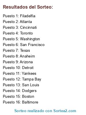 Lista de participantes: Dodgers, Washington, Filadelfia, Atlanta, San Francisco, Cincinnati, Arizona, San Louis, Anaheim, Detroit, Toronto, Texas, Boston, Tampa Bay, Baltimore, Yankees.