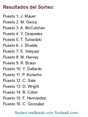 Lista de participantes: M. Garza, C. Sale, B. Colon, Y. Gallardo, E. Volquez, F. Hernandez, M. Harvey, J. Shields, P. Konerko, C. Gonzalez, T. Tulowitzki, R. Braun, J. Mauer, D. Wright, Y. Cespedes, A. McCutchen.